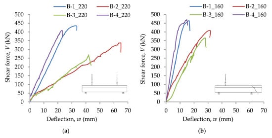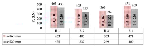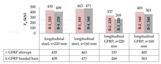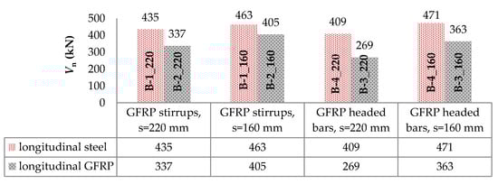 The compaction of shear reinforcement, from 220 mm to 160 mm, resulted for the B-1, B-2, B-3, and B-4 beams in increasing the load capacity by approximately 6%, 20%, 35%, and 15%, respectively. The increase in load capacity was clearly greater for beams with longitudinal composite reinforcement. It can also be observed that using a larger number of bars for shear stress transfer, which being cut by a diagonal crack accounted for the contribution of transverse reinforcement in shear capacity, resulted in a greater increase in load capacity for support zones reinforced with headed bars than with stirrups. Along with the increase in load, an increase in the strains of headed bars was recorded up to the initiation of the slipping of the bars (furthest from the top of the crack) out of their anchor heads. Along with the slipping of the bar out of the anchor head, the level of strains on this bar stabilized and the stress was redistributed, which allowed for a more regular distribution of headed bars’ strains than in the case of stirrups. Figure 11 shows a comparison of the load capacity of individual support zones by type of longitudinal reinforcement. Support zones longitudinally reinforced with steel bars were marked by a higher load carrying capacity than those longitudinally reinforced with GFRP bars. This confirmed the current conclusions from studies by other authors, including [,,,,,]. For GFRP stirrups spaced 220 mm and 160 mm, the use of longitudinal steel reinforcement resulted in an increase in load capacity of approximately 29% and 14%, respectively. In the case of GFRP headed bars spaced 220 mm and 160 mm, the use of longitudinal steel reinforcement resulted in an increase in load capacity by approximately 52% and 30%, respectively.