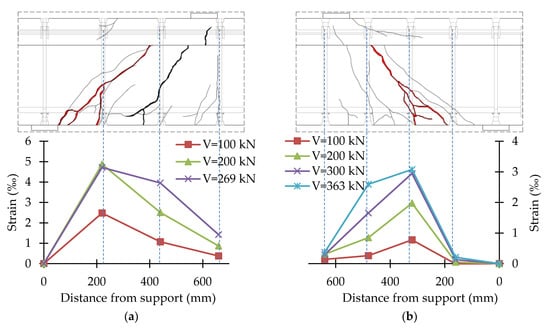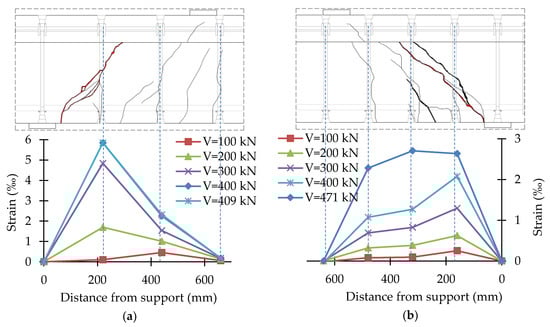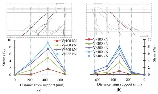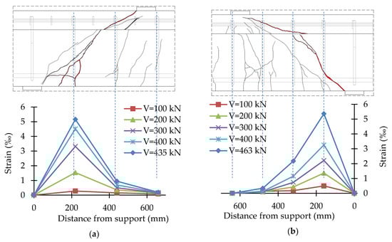 Distribution of strains of the B-4 beam support zone: (a) B-4_220; (b) B-4_160.