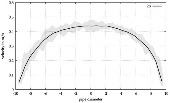 By cross-correlating the individual images with known , a velocity field was obtained for the entire image. It was assumed that the velocity did not change in the direction of the pipe axis, but only perpendicular to it. This allowed the averaging of the velocity vectors along the axis to increase the statistical accuracy. Thus, a velocity profile dependent on the distance from the pipe axis r was obtained.
