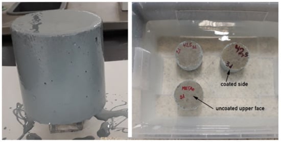 Cylindrical specimens were employed for chloride penetration testing. The surface of each specimen was protected with an epoxy bi-component resin, Sikaguard 62 (SIKA S.A.U., Madrid, Spain), except for one of the circular sides, in order to guarantee that diffusion of Cl occurred only through the circular upper face of the cylinder. Figure 1 shows one sample after coating and the position of samples with the circular upper face of the cylinder without coating immersed in artificial seawater.