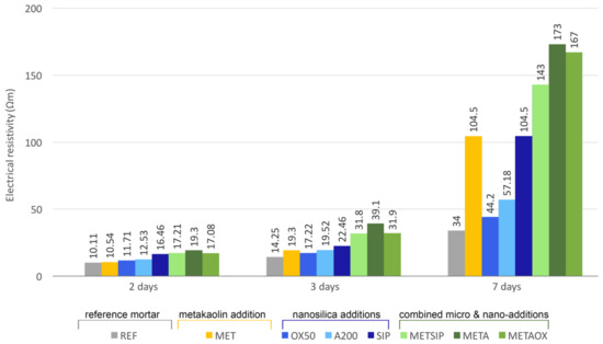 High values of electrical resistivity in mortars are related to enhanced durability, as they are an indicator of reduced porosity, preventing the penetration of aggressive agents. Our results are discussed in terms of enhancement with respect to the reference mortar, which presented the worst electrical resistivity performance with a low initial value and slow evolution (ranging from 10.11 Ωm at two days to 34 Ωm at seven days). The increase in electrical resistivity from 2 to 7 days was 236% in the reference mortar.