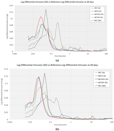 Logarithm differential intrusion vs. pore diameter at (a) two days and (b) three days, compared with the Logarithm differential intrusion vs. pore diameter of the reference mortar at 28 days.