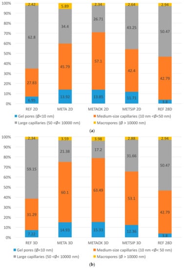 The METAOX and META mixes presented very similar behaviour, in terms of pore size distribution; particularly after three days. The differences between these two mixes at two days can be explained by the different specific surface of the nanosilica that was employed in METAOX and META: the mix containing only A200 had a faster refinement of the pores than that containing OX-50, with a greater increase of mesopores from two to three days (and a corresponding diminution of macropores). Both METAOX and META had a refined porous network at early ages, with more than 60% of mesopores at the age of three days—a value which was higher than that attained by the reference mortar at 28 days. It is necessary to take into account that a high content of large capillaries and macropores is responsible for worse durability behaviour; thus, the results indicate that mixes with combined micro- and nano-additives may have better durability performance.