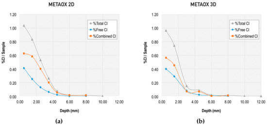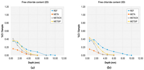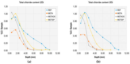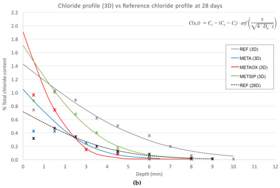 According to the results presented above, it can be concluded that the best mix, in terms of durability against chloride attack at early ages, was METAOX, as it had the lowest chloride diffusion coefficient at three days and considering its refined porous network which successfully prevents chloride penetration at greater depths. The low value obtained in this case was determined by the rapid reduction of the porosity of the material, which significantly hampers the advance of chlorides towards the interior. This motivates the increase in the surface concentration accompanied by lower content at greater depths. The high value of the surface concentration determines the low value of the coefficient.