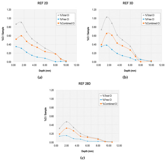 Total, free, and combined chloride content in reference mix at early ages: (a) at twodays, (b) at three days, and (c) at 28 days.