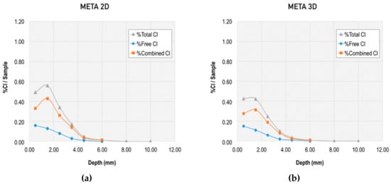 Within the studied mixes, the META mix had the lowest free chloride content, which suggests that it has a greater capacity of chloride binding. This chloride binding can be achieved either through chloride ion adsorption in the C–S–H gel or due to chemical binding forming Friedel’s salts; furthermore, the lower free chloride content in the META mix is related to its greater resistance against chloride penetration, thanks to the refined porosity at early ages (as presented in Figure 1 and Figure 2). It should be noted, however, that all of the studied combinations of nanosilica and metakaolin resulted in a reduced percentage of free chlorides, with respect to total chlorides at early ages.