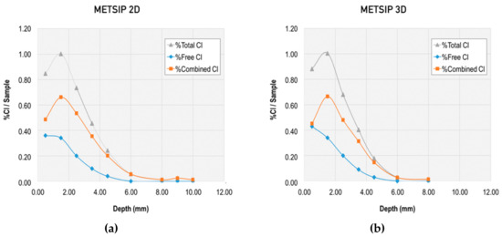 Free chloride content was obtained from dry samples with average weight of 1 g, located in 150 mL chemical vases. A stirrer and 10 mL of distilled water was added to each vase, and mixing was performed for 3 min. The sample was then filtrated into a flask with the assistance of filter paper (previously impregnated in 2 mL distilled water). After filtering, 2 mL of HNO3 conc. was incorporated, and the flask was filled up to 100 mL with distilled water. Once prepared, the samples were removed from the flask for analysis. Analysis was performed on samples under pH control with 0.5 mL of NaC2H3O2 and 20 mL of C2H4O2, using a Metrohm measurement tool which incorporates AgNO3 at known concentration and constant rate. The free chloride content could then be determined as a function of the amount of AgNO3 that was added.