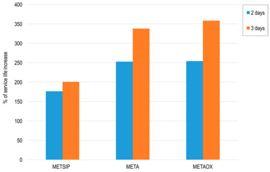 As mentioned above, the propagation period cannot be altered by changing the durability properties of the mix. In this sense, the change in the initiation period matters more, as it can lead to better use of the material, allowing smaller cover depths. The initiation periods were much longer for the mixes with combined micro- and nano-additives than that of the reference mortar. This increase is graphically presented, in Figure 13, for early exposure to the marine environment (two and three days).