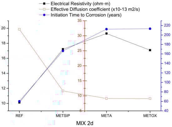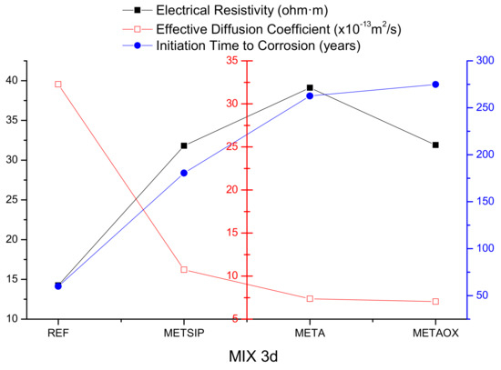 From Figure 13 and Figure 14, it can be observed that high values of electrical resistivity resulted in low values of effective diffusion of chlorides. There was no direct proportionality between the two properties, as there were several parameters affecting the resistance against penetration of chlorides; however, it became clear that both refined porous networks and binding capacity worked together to limit the chloride penetration and thus propitiate a delay in the corrosion initiation time.