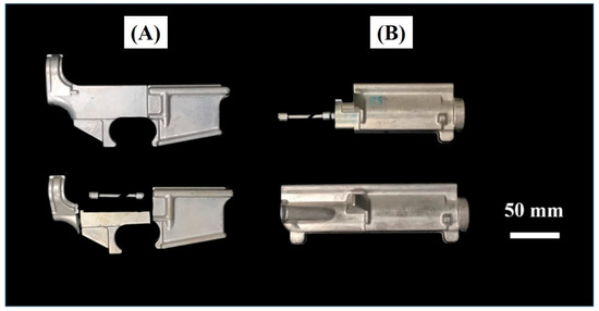 We used commercial hot forging 7075 aluminum alloy. The hot forging 7075 forgings were made from 52 mm diameter cylindrical extruded rods, where the chemical composition is shown in Table 1. To make sure the experiment results can be used in different shapes of hot forging 7075 aluminum parts, two different shapes of parts were used in this study. Photographs of hot forging 7075 aluminum parts are shown in Figure 1.