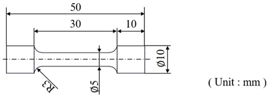 All tensile tests were performed using a universal testing machine at room temperature with a stretching rate of 5 mm/min. The dimensions of the tensile test specimen are shown in Figure 3. Young’s modulus values were calculated from Young’s region of the tensile test graph, based on the formula as follows: E = ∆σ/∆ε.
