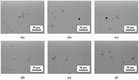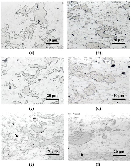 Metallographic investigations of the microstructural features and grain size were conducted using optical microscopy (OM, OLYMPUS BX41M-LED, OLYMPUS, Tokyo, Japan). All specimens (with the top surface perpendicular to the extrusion direction) were polished using SiC papers from #120 to #4000 grit in an Al2O3 aqueous suspension (1.0 and 0.3 μm) and a SiO2 polishing suspension and etched using Keller’s reagent.