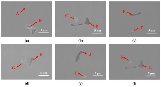 Figure 5 and Table 4 and Table 5 show the results of SEM observation and EDS analysis. According to the EDS analysis results, the gray compound (A, C, E, G, I and K compounds of Figure 5) was Al-Cu-Cr-Fe, and the black compound (B, D, F, H, J and L compounds of Figure 5) was Al-Mg-Si-Cr. According to previous research [12], Al-Cu-Cr-Fe and Al-Mg-Si-Cr compounds formed during casting and were rearranged during the hot forging process. Both Al-Cu-Cr-Fe and Al-Mg-Si compounds were stable at 480 °C. Thus, Al-Cu-Cr-Fe and Al-Mg-Si-Cr compounds remained after heat treatment at 480 °C for 120 min (Figure 4b,c,e,f).