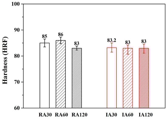 Figure 7 and Figure 8 show the hardness results of forging A and forging B after various heat treatments. The hardness values of forging A specimens were higher than the values of forging B specimens. This result was due to the difference in metal flow during the forging process (different shapes are subjected to different stresses). It should be noted that for both RH- and IR-heated specimens, hardness after 30 min of treatment was the same as that after 120 min.