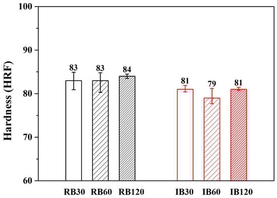EDS analysis results for specimens as-received B, RB120, and IB120, as shown in Figure 5d–f, respectively.