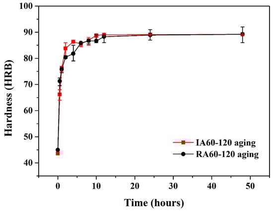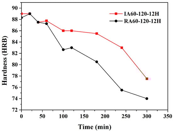 In this study, 200 °C was used as the high-temperature resistance test temperature. Karaaslan et al. [16] found that when the temperature reaches 200 °C, GP zones dissolve, and the material softens. However, the material is strengthened by the precipitation of the η’ phase in the following stage. Strength is enhanced by η’ precipitates, and the material softens when the η’ precipitates become the η phase. The material also softens when over-aging occurs [5]. Danh et al. [5] found that at 200 °C, GP zones dissolve within 10 min and over-aging occurs after 30 min. Figure 11 shows the time and hardness profiles of 200 °C heating of T6 (IA60-120-12H and RA60-120-12H) specimens. The hardness increases within 30 min due to the re-precipitation and phase transformation of GP zones. Over-aging also occurs within 30 min. It should be noted that the IR-heat-treated specimen has a slower softening rate at high temperatures.