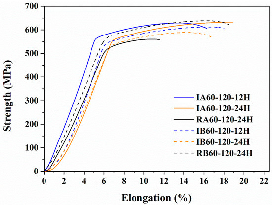 Figure 10 shows the results of the tensile test. It could be observed that IR heat treatment gave the material tensile strength and ductility like that of the RH-heated material. It should be noted that the IR-heated specimens artificially aged for 12 h (IA60-120-12H/IB60-120-12H) and had strength and elongation similar to that of RH-heated specimens artificially aged for 24 h (RA60-120-24H/RB60-120-24H). Thus, IR heat treatment could shorten the artificial aging time to 12 h.
