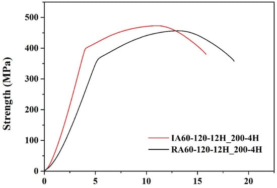 Figure 12 and Table 7 show the results of the tensile test of high-temperature resistance test specimens. The tensile test was carried out after heat treatment at 200 °C for 4 h. We found that the tensile strength decreased, and ductility increased, indicating that over-aging occurred for both specimens. Additionally, IA60-120-12H_200-4H showed higher strength (yield strength, YS: 400 MPa, ultimate tensile strength, UTS: 474 MPa) than that of RA60-120-1F2H_200-4H (YS: 367 MPa, UTS: 458 MPa), indicating better high-temperature resistance. Even after heat treatment at 200 °C for 240 min, the IR-heated specimen showed a better Young’s modulus than that of the RH-heated specimen.