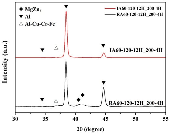 In the XRD patterns (shown in Figure 13), according to our previous research [11], MgZn2 and Al-Cu(Cr)Fe compounds could be observed. Comparing RA60-120-12H_200-4H and IA60-120-12H_200-4H specimens, RA60-120-12H_200-4H has a more obvious MgZn2 peak compared to that for IA60-120-12H_200-4H. By comparing to the results in Figure 11, there are more MgZn2 formed in the RA60-120-12H_200-4H; while MgZn2 is representative of over-aging.