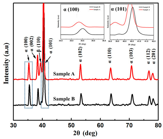 Figure 3 shows the XRD patterns of the as-fabricated samples under different processing parameters. The diffraction peaks of the samples correspond to hcp-Ti (α phase) and bcc-Ti (β phase). The intensity of the β phase diffraction peak in sample A is higher than that of sample B, indicating higher contents of the β phase in the former. In addition, the diffraction peaks (100)α and (101)α shift toward higher angles in sample B (Figure 3). According to Bragg’s law, the observed increase of 2θ indicates a decrease in the lattice plane distance d, which is considered to be related to the prevailing martensitic transformation [30,35]. The occurrence of martensitic transformation is accompanied by microscopic volume expansion, which decreases the lattice parameters [36]. The high cooling rate during solidification of sample B is beneficial for promoting the martensitic transformation [37] and results in the shift of diffraction peaks (100)α and (101)α toward higher angles.