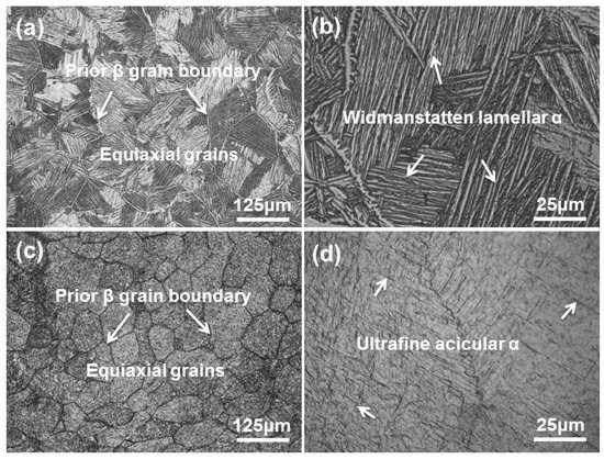 Figure 5 shows the typical SEM morphologies of as-fabricated samples. The SEM micrographs are analogous to the OMs of as-fabricated samples in terms of prior β grain morphology (Figure 5a,c). Sample A is dominated by coarse lamellar α phases (Figure 5b). Compared with sample A, sample B shows finer equiaxed prior β grains in which submicron acicular α phases are embedded (Figure 5d). The thickness of the α phase is between 60 and 400 nm, which is smaller than that of 0.6–2.8 µm reported in the literature [20,22,23,38]. The ultrafine microstructure means that more excellent mechanical properties can be obtained.