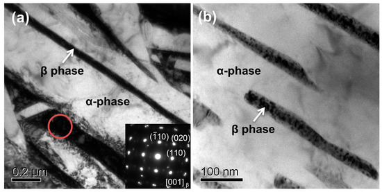 In order to further identify the structures of phases in the samples, TEM analysis was employed. Figure 6a,b indicates bright-field (BF) TEM micrographs of samples A and B, respectively. As shown in Figure 6a, a few of the lamellae in black contrast lay across fields of whole pictures. These lamellae are bcc-Ti (β phase) that is retained during the phase transformation of β→α. Inserted selected area electron diffraction (SAED) from the red circle in Figure 6a is indexed and indicates that the phases in black are identified as bcc-Ti (β phase). The average thicknesses of lamellae are estimated between 70 and 200 nm. However, both the amounts and sizes of lamellae in sample A are obviously larger than those of sample B (Figure 6b). The TEM observations are in accordance with the XRD results.