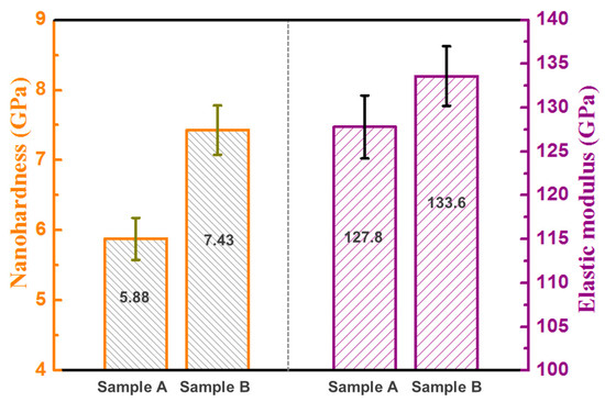 Sample B shows a high nano-hardness of 7.43 GPa, which is higher than that of sample A and conventional Ti6Al4V alloys. In addition, the hardness of sample B is also higher than that of results reported in the literature [21,22,23]. The high nano-hardness level is attributed to the refinement of β grains and the formation of the submicron acicular α phase. The increase of boundaries or interfaces enhanced the hindering effect on dislocation glide and therefore improved the hardness of sample B. In addition, the high level of residual stress in the as-fabricated samples also contributed to the high nano-hardness and elastic modulus.