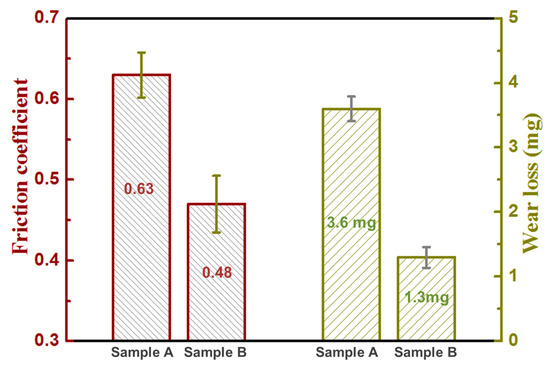 - Compared to sample A, sample B showed a very high hardness of 7.43 GPa, a high elastic modulus of 133.6 GPa, a low coefficient of friction of 0.48, and a low wear loss of 1.3 mg.