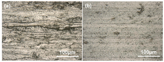 The worn surface of sample A is characterized by parallel and deep grooves, with some fragments on the groove edges, which indicate the occurrence of abrasion and fatigue wear (Figure 9a). During the back and forth wear tests, contact fatigue caused by alternating stress between the substrate and counterpart occurred, resulting in fragments that acted as abrasive particles. Compared to sample A, the worn surfaces of sample B were smoother. Shallower grooves and an almost total absence of any abrasive fragments were observed on the worn surfaces (Figure 9b), indicating that the main wear mechanism is slight fatigue and abrasive wear.