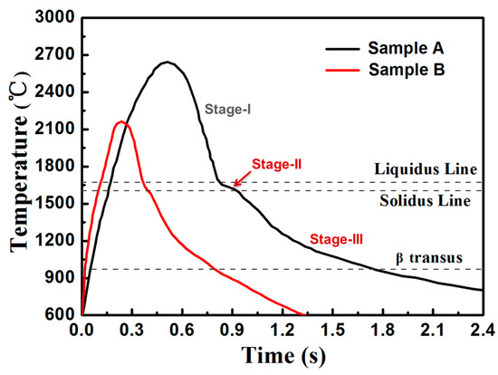 The solidification microstructure is related to the thermal behavior of the molten pool. Thus, the molten pool temperature was recorded and calculated to interpret relationships among the thermal behavior, processing parameters, and solidification microstructure. Figure 10 shows the thermal curves of the molten pool of two samples. The temperature of the measured point rapidly increased to the peak temperature with the approach of the laser beam and then rapidly cooled to the minimum temperature as the laser beam moved away. Compared to sample A, the temperature curve of sample B shows a lower peak temperature, a shorter thermal cycle, and a faster decrease in molten pool temperature. The cooling stage could be simply divided into three stages, i.e., stage I (cooling stage of liquid phase), stage II (solidification stage), and stage III (cooling stage of solid phase). Among these cooling stages, the solidification parameters of stage II determine the solidification process, while the thermal parameters of stage III influence the solid–state phase transition.