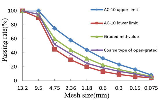 ESSO 90# asphalt binder and Jinyang emulsifier from Tianjin Province, China, were selected to prepare the emulsified asphalt. The properties of asphalt and prepared emulsified asphalt are shown in Table 1 and Table 2, respectively. Two types of waterborne epoxy resins were selected, named X waterborne epoxy and Y waterborne epoxy, respectively. Two types of curing agents were also selected, named A curing agent and B curing agent, respectively. The properties of the waterborne epoxy used in this work are displayed in Table 3. The limestone aggregate with a nominal maximum size of 9.5 mm and gradation shown in Figure 1 was produced from a local quarry in Shanxi Province, China, has a density of 2.702 g/cm3 and compressive strength of 135 MPa.