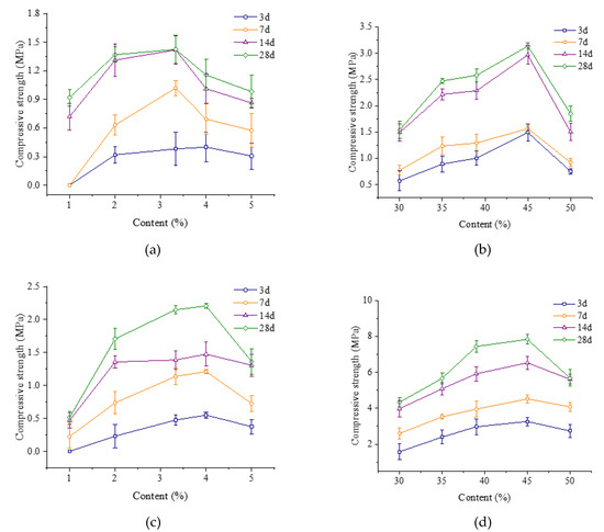 Compressive strength of different WEM with different curing agent and content. (a) Compressive strength of X WEM under different curing agent A contents; (b) compressive strength of X WEM under different curing agent B content; (c) compressive strength of Y WEM under different curing agent A content; (d) compressive strength of Y WEM under different curing agent B content.