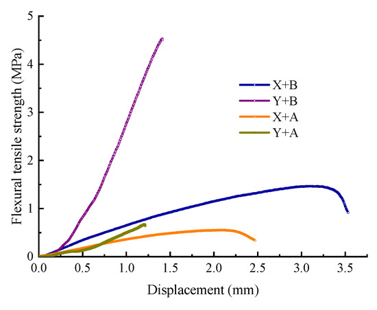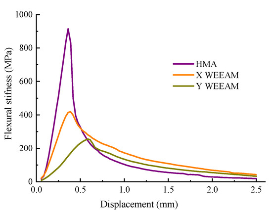 The results in Table 6 and Figure 7 indicate that there were significant differences in the low temperature crack resistance of different types of mixtures. It can be found that compared with the low temperature performance of HMA, the flexibility of WEEAM still needs to be improved. In fact, the flexural strength of WEEAM can reach 28–42% of HMA, and only 10–16% of the flexural strength of EMA [20]. This is mainly because the air voids of WEEAM are significantly larger than those of HMA due to the compaction molding method and material characteristics. Moreover, the closed voids formed by non-volatile water in WEEAM, which is the weakness of the materials, will lead to early failure of the specimen under the influence of external force. In addition, the epoxy resins were brittle at low temperatures and easily failed at lower strain, resulting in the poor fracture performance of WEEAM [18,20]. It can also be observed that the flexibility of Y WEEAM was worse than that of X WEEAM.