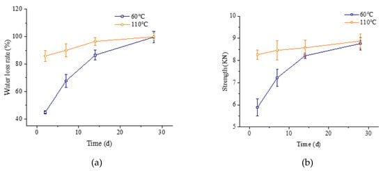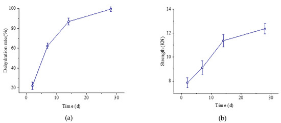 The forming strength was evaluated by measuring the stability of the immersed specimen soaked in a 60 °C water bath for 30 min. Samples were compacted 35 times in the first stage and 40 times in the second stage after curing at 60 °C and 110 °C for 24 h, respectively, then curing at 25 °C for 48 h, 7 d, 14 d, and 28 d after demolding. The dehydration rate and compressive strength are shown in Figure 5.