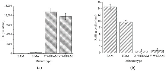 Figure 6 shows the wheel tracking test results of the different types of mixtures. The dynamic stability of WEEAM increased by more than 98 times, and the rutting depth decreased by more than 11 times in comparison with EAM and HMA, indicating that waterborne epoxy has good high temperature rutting resistance. EAM is inferior in high temperature performance to HMA because of the presence of additives such as emulsifiers and stabilizers. HMA exhibits low viscosity and good rheology at high temperatures due to the thermoplasticity of the asphalt. However, the significant improvement in the high temperature performance of WEEAM is due to the thermosetting properties of the epoxy resin, which forms a three-dimensional continuous phase after curing [14,18]. Such mixtures are not only tough, but are also elastic at typical pavement service temperatures. The DS value of WEEAM could reach about 80–93% of the DS value of the epoxy asphalt mixture (EAM), and the rutting depths were comparable to the rutting depths of the epoxy asphalt mixture (EAM) [19,20].
