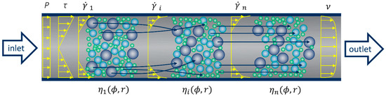 Due to the non-uniform distribution of shear stresses over the cross-section, forces of different magnitudes are acting on the various particle surfaces. The resultant forces induce a radial displacement of the particle in addition to its transient displacement along the pipeline [25]. The larger particles migrate toward the center of the pipeline with lower shear rates, and the water and finer particles move to the wall to fill the space; see arrows in Figure 1. The non-uniform particles distribution induces different local viscosities in the radial direction (). The increase in local viscosities from the wall to the centerline hinders the migration and eventually results in equilibrium and steady state () after a critical deformation [3].
