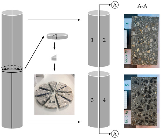 Thin discs were cut from the cylinders. They were purposely divided into nine circular sectors for X-ray microcomputed tomography (μCT). The two remaining cylinders were longitudinally cut along the A–A axis. The resulting half-cylinders (1 + 2 and 3 + 4) were visually assessed in respect of their lubricating layer thicknesses. The examples of the A–A cross-section in Figure 4 clearly indicate a lower concentration of coarse aggregates at the vicinity of the pipe wall due to the high shear rates in this region.