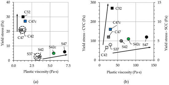Based on the composition, the ratios among the solid constituents, the water-to-binder ratio (w/b), and the dosage of superplasticizer were kept constant for the mortars. C42 and S37 with volumetric aggregate content reduced by 5% showed similar rheological behavior to that of C47 and S42; see Figure 8a. However, this is not the case for mixtures C52 and S47 having 5% higher aggregate contents than the reference mixtures. This holds true also for C47c and S42c with crushed aggregates. For these four mixtures, both yield stress and plastic viscosity tend to increase; in CVC, the yield stress was significantly influenced while for SCC it was the plastic viscosity. Some increase in the rheological parameters of mortars could be observed with increasing aggregate content in concrete and replacement of round aggregates by crushed aggregates. These changes can be likely traced back to a more pronounced adsorption of the cement paste by coarse aggregates in those mixtures due to higher surface area of aggregates > 1 mm. Consequently, the sieved mortar contained less cement paste and water. The composition analysis of the sieved mortars confirmed this hypothesis. First, the authors determined the water content of the sieved mortar by drying. Then the actual and nominal water contents of the mortar were compared. The difference showed the amount of water adsorbed by aggregate surfaces together with fine solid particles. As a result, the additional 5% of aggregates of the mixtures C52 and S47 decreased the content of water in the corresponding mortars by 0.72% and 0.82%, respectively, in comparison to the reference mixtures. The rough surface of basalt aggregates in C47c and S42c also resulted in less water in the mortars: by 0.52% and 0.47%, respectively.