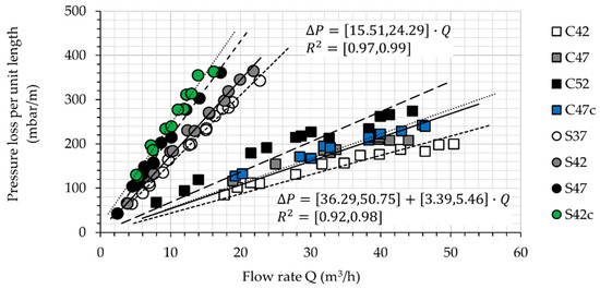 During each stroke of the Sliper, only 0.5 m height of the material is being deformed (“pumped”) during the experiment. By dividing the observed pressure values by 0.5 m, the pressure loss per unit length in a DN125 pipe can be calculated and drawn at different discharge rates and for each composition. Figure 9 illustrates these data points and the linear correlation between and for all mixtures.
