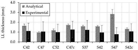 Comparison between experimentally and analytically determined thicknesses of the lubricating layer for all concretes under investigation.