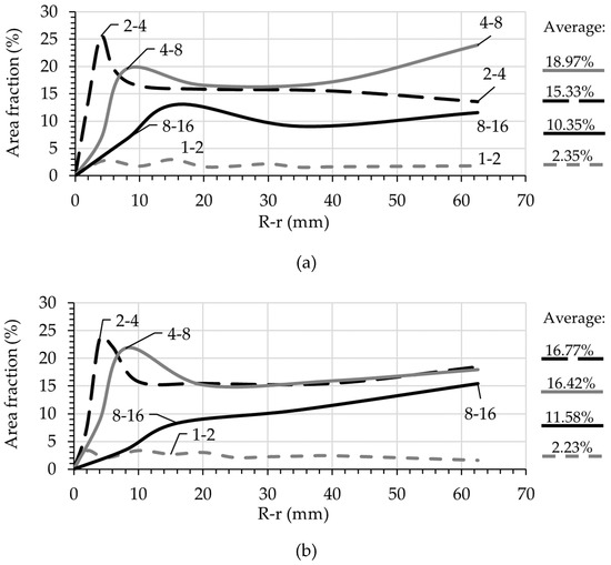 Surface area occupied by different groups of particles over the radial direction after pumping for (a) S47 and (b) C47. The overall average for each size is listed on the right side of the graph.