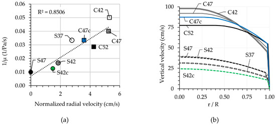 with and as the vertical velocity at radius (m/s) and total discharge rate (m3/s). , and are pressure loss per unit length (Pa/m), the radius of the pipe (m), and the viscosity of the Newtonian fluid (Pa·s). Equation (10) shows that the focal width of the velocity parabola is directly proportional to the ratio between the pressure loss and apparent viscosity . To check whether this holds for non-Newtonian fluids as well, the inverse of plastic viscosity and the normalized radial velocities are compared in Figure 12a. The results show good correlation between these two parameters. The non-zero ordinate intercept is due to the formation of the plug during concrete flow.