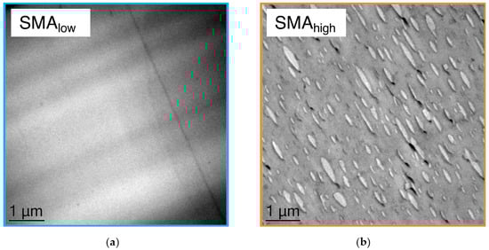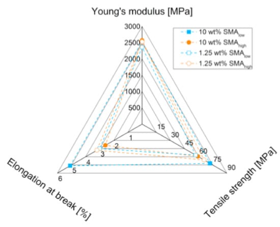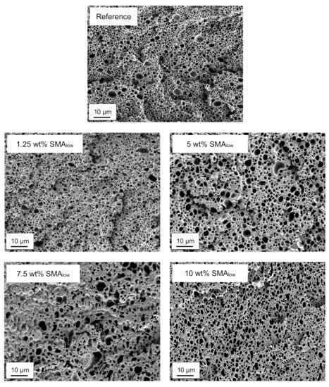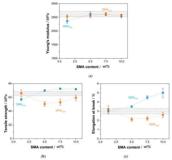 In comparison to the reference blend, Figure 7a shows a reduction in Young’s modulus with 1.25 wt% SMAlow (2360 MPa), whereas a recovery is seen with a maximum at 5 wt% (2620 MPa). The further incorporation of SMAlow causes lower modulus values of 2540 MPa (10 wt%), which still is in the range of the reference. For SMAhigh, the modulus is found to be independent of the SMA content, showing no significant change.