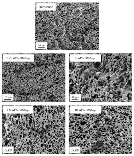 Figure 4 exhibits the SEM micrographs of PA66/PPE blends with 1.25, 5, 7.5 and 10 wt% SMAhigh content together with the reference.