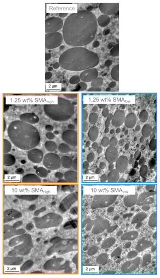 As shown in Figure 3 and Figure 4 both SMAlow and SMAhigh lead to droplet-sea morphology for 1.25 wt%. A co-continuous morphology is only observed for 10 wt% SMAhigh with a transition between 1.25 and 7.5 wt% and co-continuous morphology for 10 wt% SMA content. To validate the morphological interpretations via SEM, TEM micrographs of the reference and blends with 1.25 and 10 wt% SMA (low and high) are shown in Figure 5.