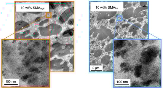 The apparent changes within the PA66 phases are highlighted by TEM micrographs at higher magnifications for 10 wt% SMA (low and high) given in Figure 6.