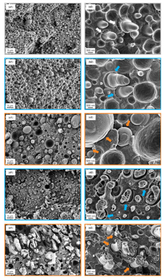 For 1.25 wt% SMAhigh (Figure 8c1,c2), a smooth fracture surface is seen for having a low plastic deformation of the PA66 matrix. The PPE phase is mainly pulled-out, revealing cavities with very smooth surfaces, indicating weak interfaces (orange arrows). As SMAhigh has a low affinity to PPE, it remains in the PA66 phase and does not disturb the formation of covalent bonds between PA66 and PPE. As for the reference, elongated PPE domains are seen, indicating locally strong interfacial bonds.