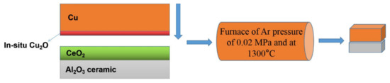 Many researchers have carried out the research. At present, brazing and diffusion bonding are the main methods to achieve connections between ceramics and metals. Breslin et al. [5] have suggested that the key problem was the interfacial wettability between the ceramics and metals, so a method of co-continuous ceramic composites was proposed [6,7]. The surface of ceramics coated a layer of Mo–Mn could improve wettability [8]. Active metals, such as Ag, Ti, Zr and V, have been added to study effects. However, general oxygen content was lower than 1 Pa to avoid oxidizing [9,10,11]. Burgess et al. [12,13] have used a Cu-Cu2O eutectic liquid system to bond Cu layers with ceramics for the first time. However, Fan Jinglian et al. [14] have discovered that wettability between Cu and Al2O3 was still not significantly improved when the temperature was increased from 1200 to 1400 °C.