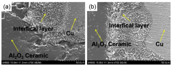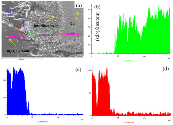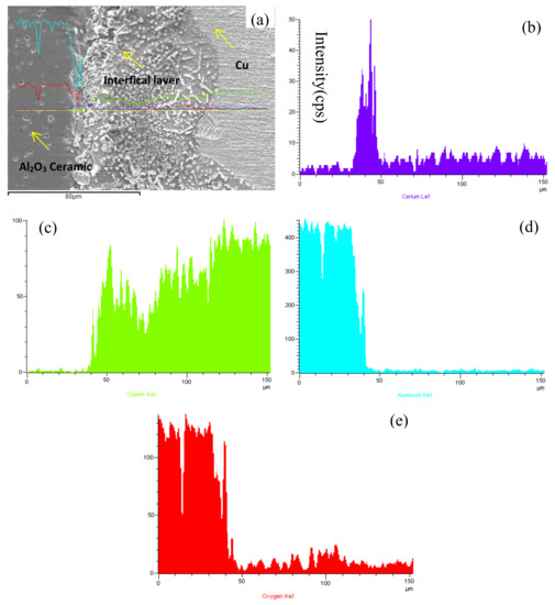 Moreover, the content of Ce arises from the range of 0–150 μm due to the addition of CeO2. Figure 5b shows that the CeO2 coated on the surface of the alumina ceramics can easily diffuse into the metallic Cu layer, but not to the Al2O3 ceramics. O and Cu easily form a eutectic liquid of Cu2O–Cu under certain conditions [12,13], so CeO2 can accelerate to form the eutectic liquid of Cu2O–Cu by storing or releasing O at Ar pressure of 0.12 MPa. However, in the range of 40–150 μm, the content of Cu is the highest, and the contents of O and Al are reduced. The eutectic liquid of Cu2O–Cu is the key factor in improving the wettabilities of the Cu and Al2O3 layers.
