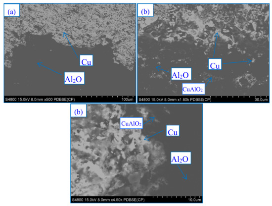 The authors in [17] reported that, due to the mutual diffusion and redistribution of chemicals in the melting process, these oxides react with Al2O3 under certain conditions to form CuAlO2, which is beneficial to the improvement of wettability [8]. The corresponding Gibbs free energies (ΔG0) [25] are as follows: